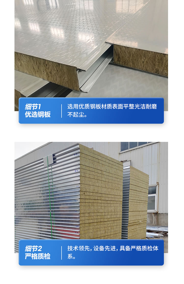 2)保温隔热性好:岩棉夹芯板的保温隔热性是以岩棉的导热系数λ=0.043 W / m2 K为依据,以相应比例的岩棉芯材的厚度计算求得的。