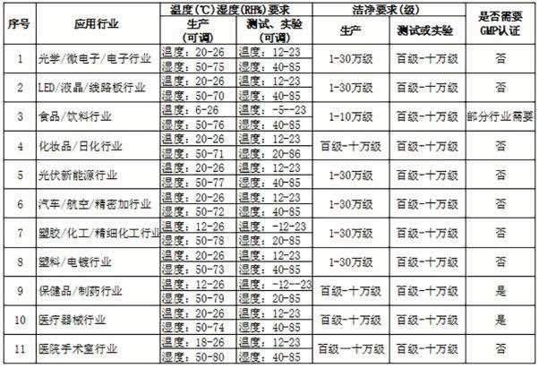 不同行业,因其不同的生产工艺、原材料特性、人员参与数量和地区差异,相对应不同的洁净室温湿度标准,具体如列表: